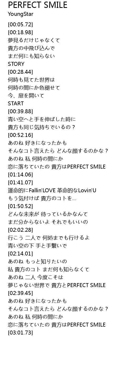 | [01:09.62] | 恋に落ちていたの 貴方はPERFECT SMILE |