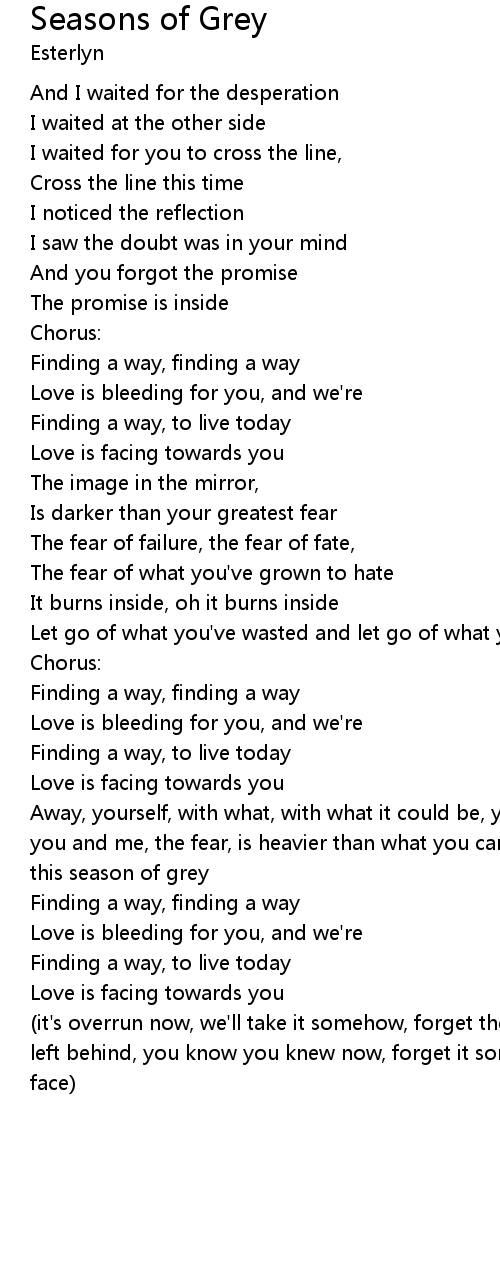| Away, yourself, with what, with what it could be, you let, the sun, go down on you and me, the fear, is heavier than what you can bear, and love will lighten this season of grey | |