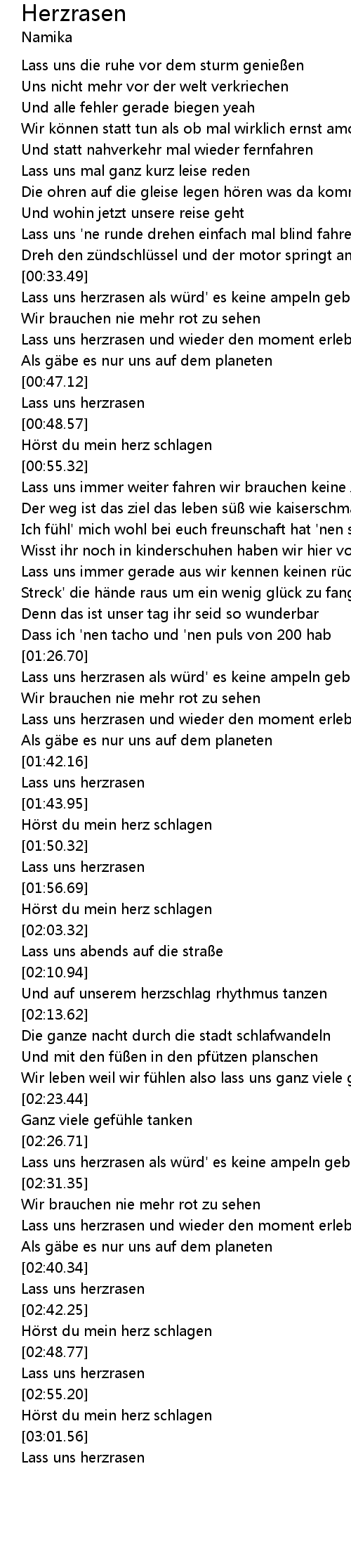 | [01:36.36] | Lass uns herzrasen und wieder den moment erleben |