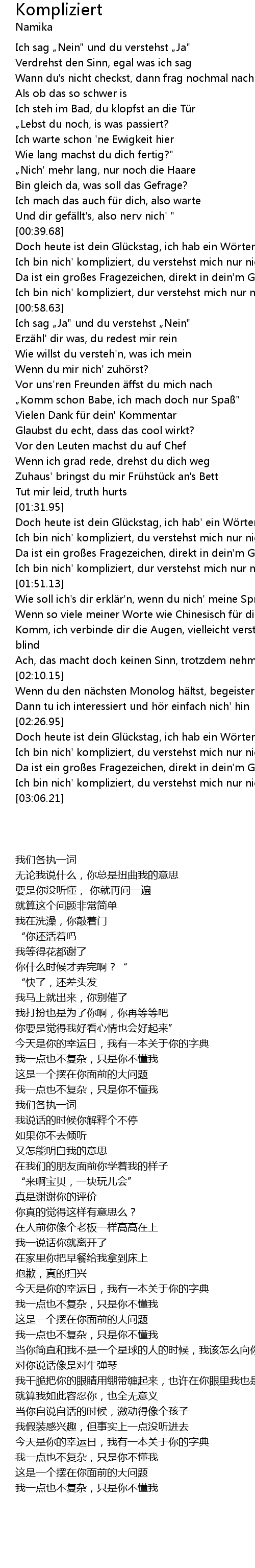 | [00:54.36] | Ich bin nich' kompliziert, dur verstehst mich nur nich' |