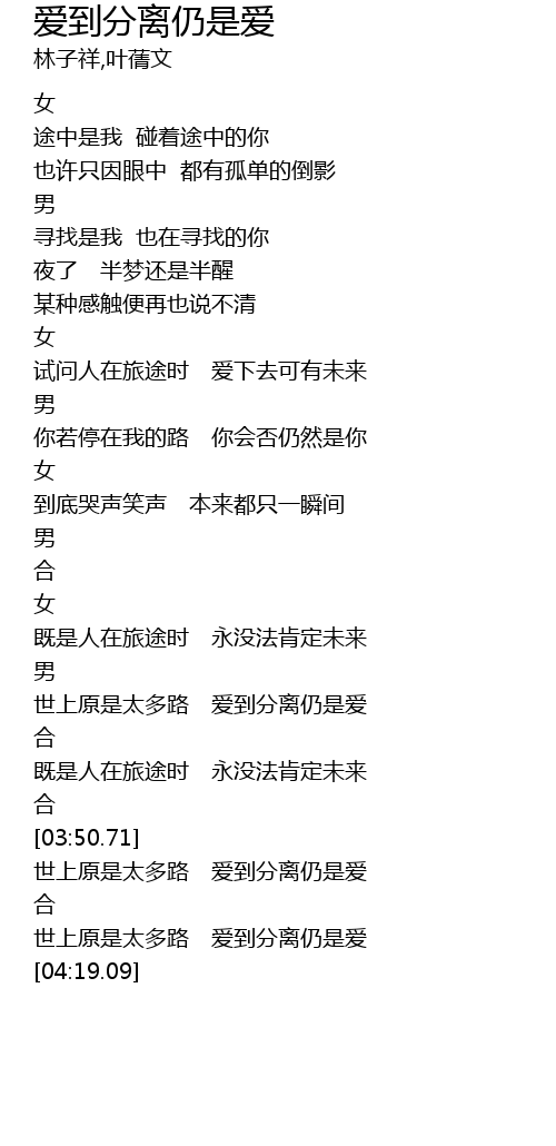 | [03:22.56] | 世上原是太多路 爱到分离仍是爱 |