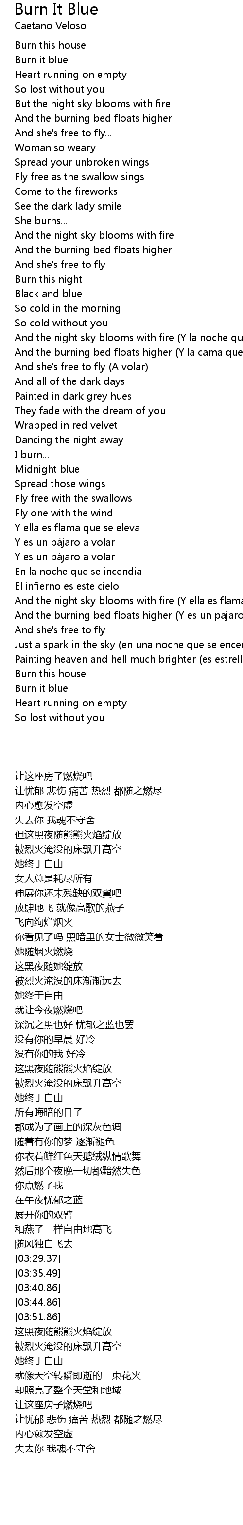 | [03:57.33] | And the night sky blooms with fire Y ella es flama que se eleva |
