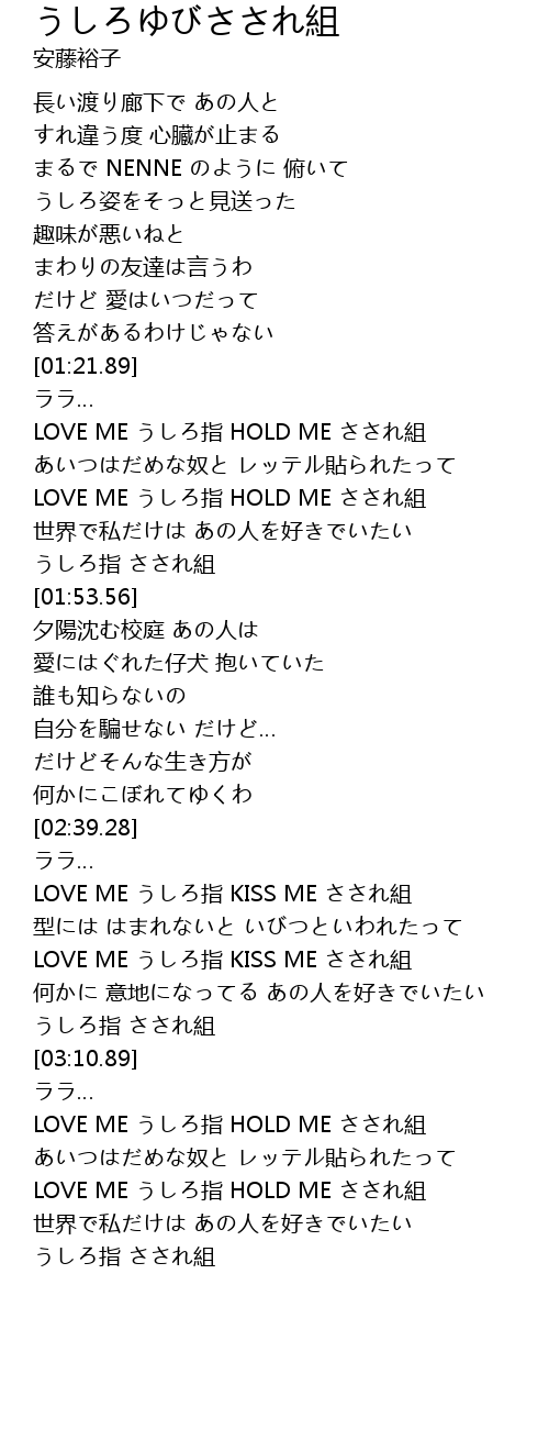 | [01:23.82] | LOVE ME うしろ指 HOLD ME さされ組 |