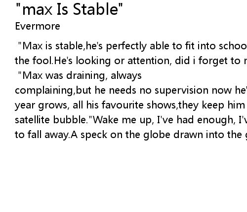 [Teacher:] "Max is stable,he's perfectly able to fit into school,he just plays the fool.He's looking or attention, did i forget to mention?Give him his medication before his education."[Parent:] "Max was draining, always complaining,but he needs no supervision now he's watching television.As each year grows, all his favourite shows,they keep him out of trouble in his satellite bubble."Wake me up, I've had enough, I've seen too much.I don't want to fall away.A speck on the globe drawn into the glow. |