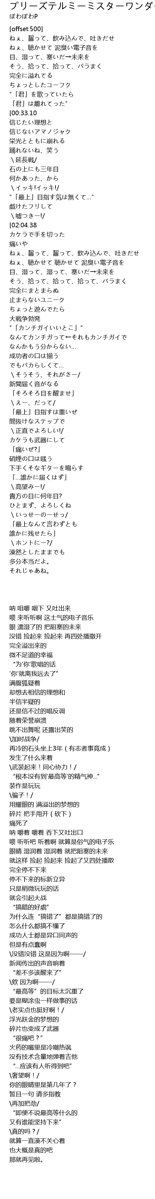 | [00:19.47] | 目、湿って、塞いだ→未来を |