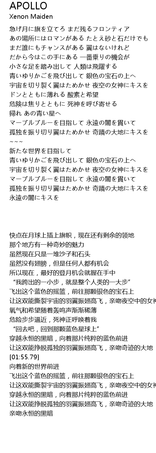 | [02:41.44] | 宇宙を切り裂く翼はためかせ 夜空の女神にキスを |