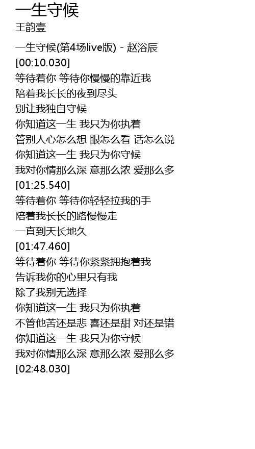 | [00:02.030] | 一生守候(第4场live版) - 赵浴辰 |