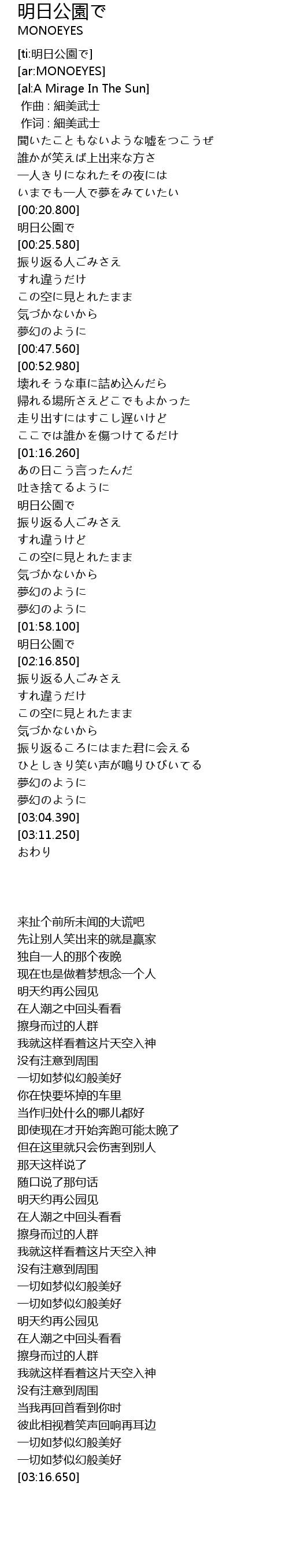 | [00:00.610] | 聞いたこともないような嘘をつこうぜ |