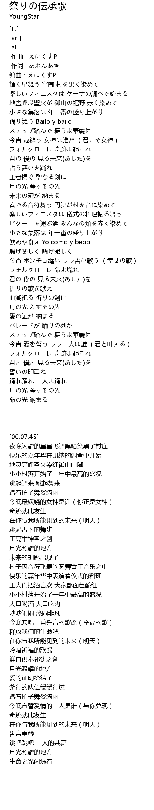 | [00:16.29] | 輝く星舞う 宵闇 村を黒く染めて |