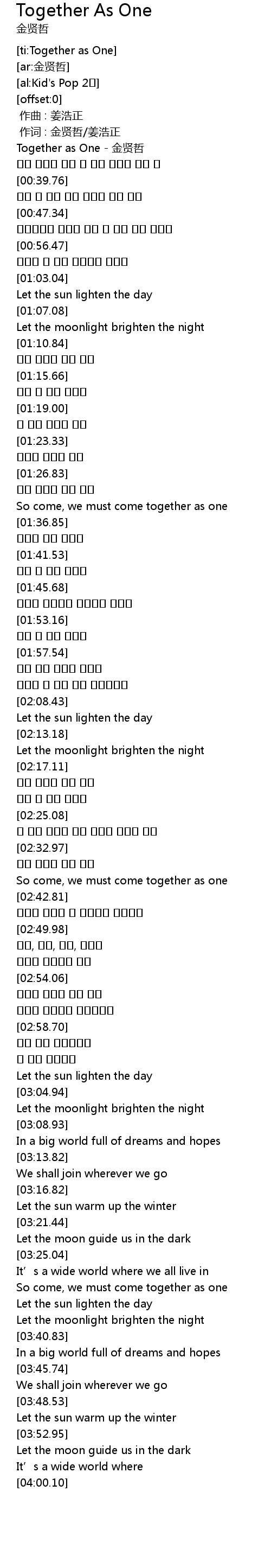 | [00:00.62] | Together as One - 金贤哲 |