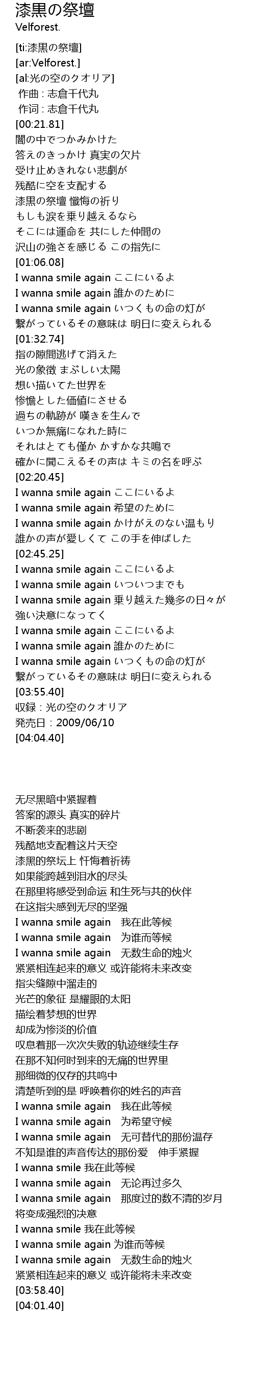 | [02:21.21] | I wanna smile again ここにいるよ |