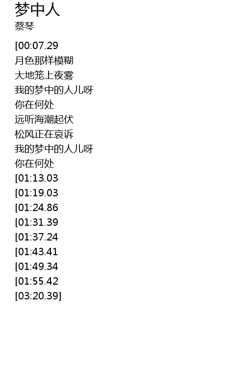 | [03:02.41][01:49.34] | 我的梦中的人儿呀 |