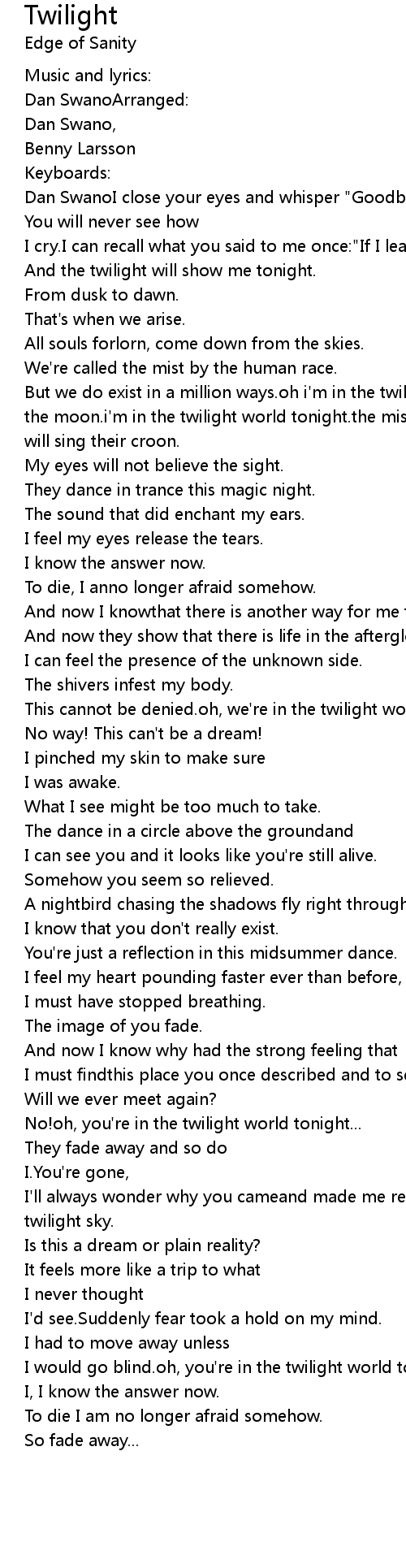 But we do exist in a million ways.oh i'm in the twilight world tonightand i obey the moon.i'm in the twilight world tonight.the mist will dance and the elves will sing their croon. |