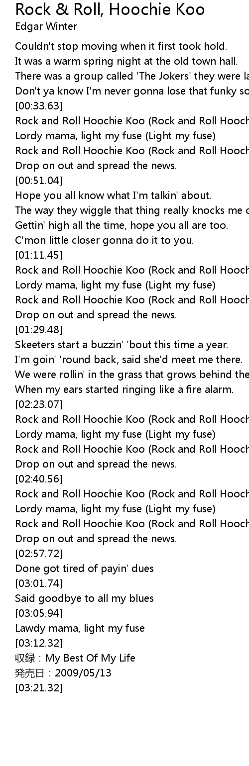 | [00:35.62] | Rock and Roll Hoochie Koo Rock and Roll Hoochie Koo |