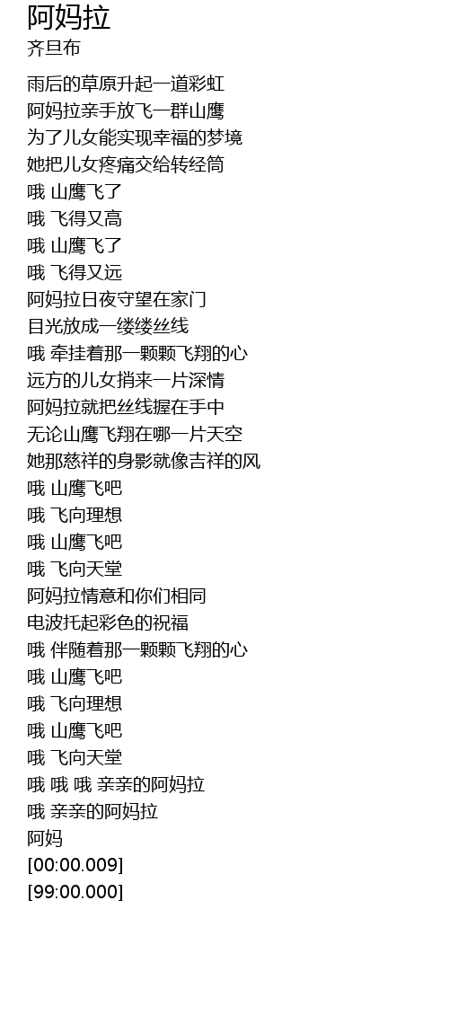 | [04:26.94] | 哦 哦 哦 亲亲的阿妈拉 |