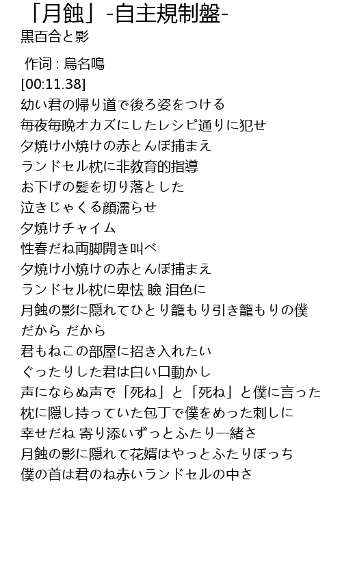| [01:50.60] | 月蝕の影に隠れてひとり籠もり引き籠もりの僕 |