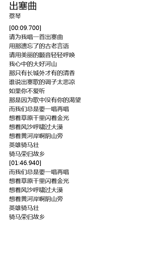 | [00:25.410] | 请为我唱一首出塞曲 |