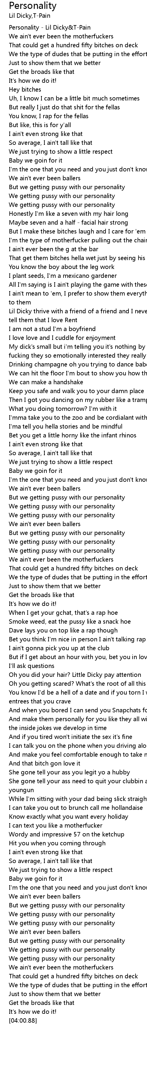 | [03:44.66] | We getting pussy with our personality |