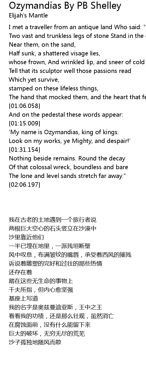Two vast and trunkless legs of stone Stand in the desert . . . |