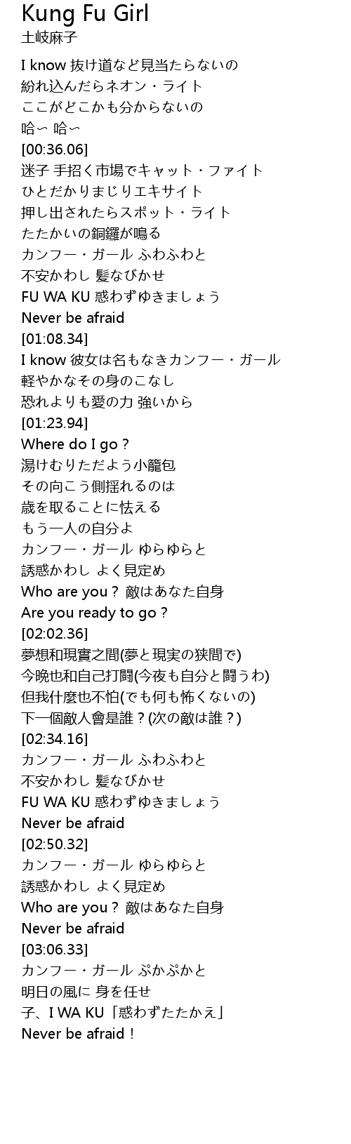 | [01:08.96] | I know 彼女は名もなきカンフー・ガール |