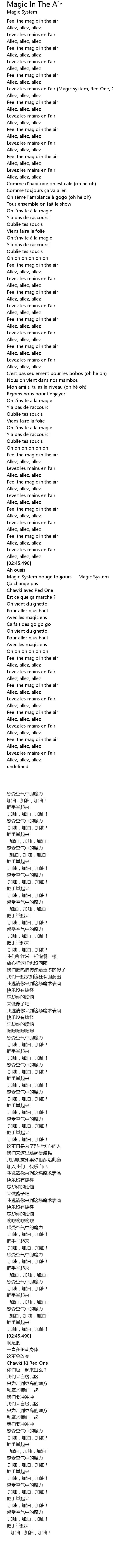 | [00:19.040] | Levez les mains en l' air Magic system, Red One, Chawki |