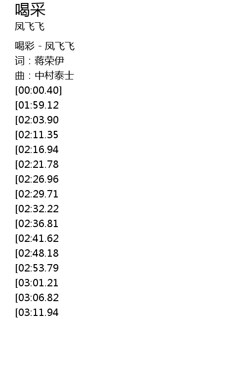 | [00:00.10] | 喝彩 - 凤飞飞 |