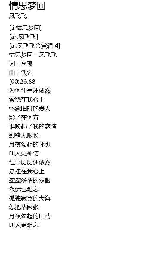 | [00:00.06] | 情思梦回 - 凤飞飞 |