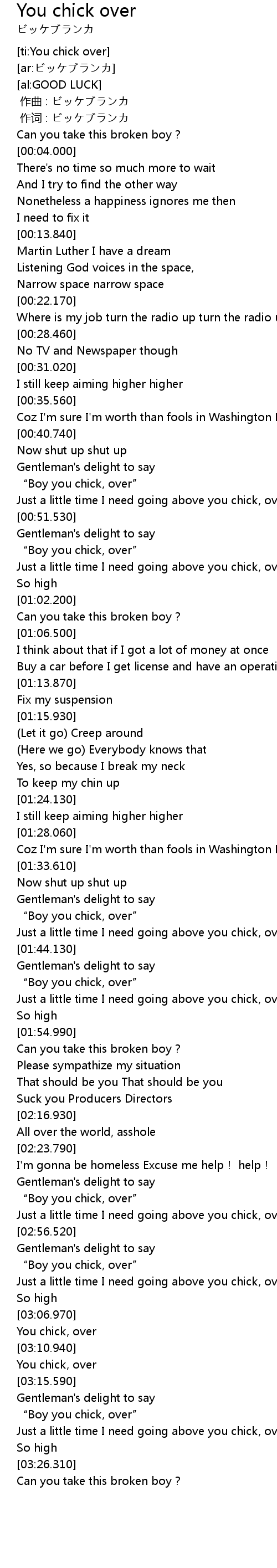 | [01:47.110] | " Boy you chick, over" |
