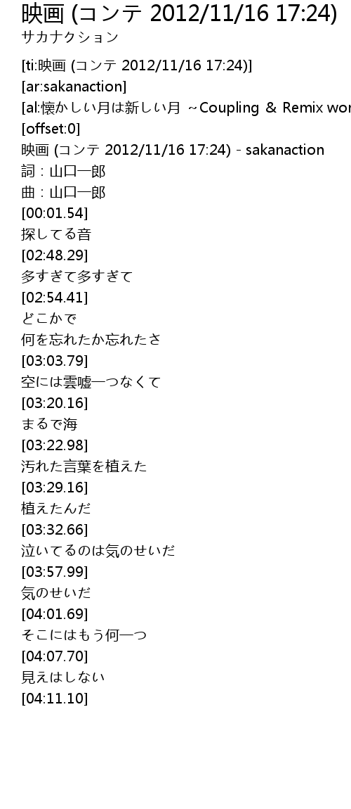 | [00:00.16] | 映画 (コンテ 2012/11/16 17:24) - sakanaction |