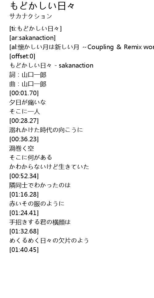 | [00:00.22] | もどかしい日々 - sakanaction |