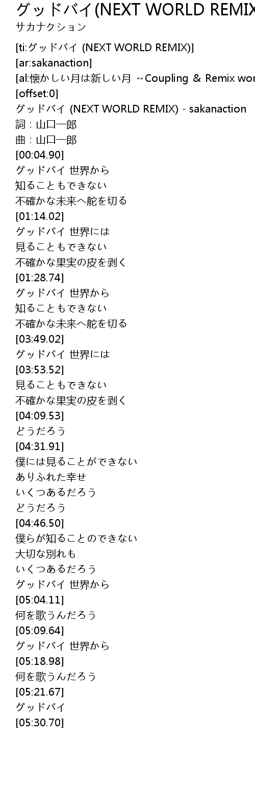 | [00:00.60] | グッドバイ (NEXT WORLD REMIX) - sakanaction |