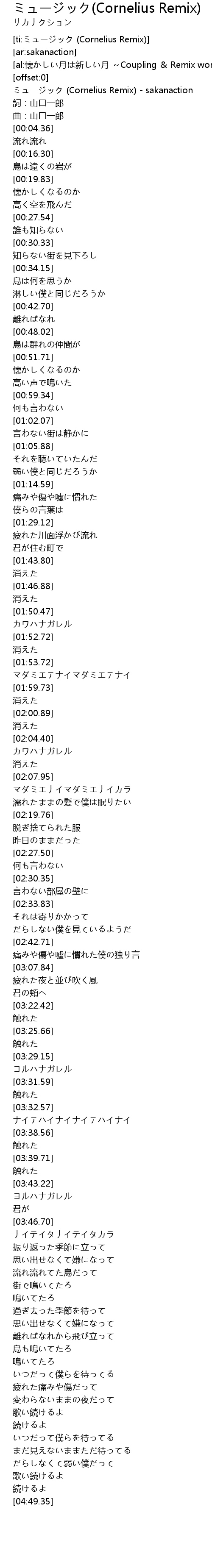 | [00:00.28] | ミュージック (Cornelius Remix) - sakanaction |