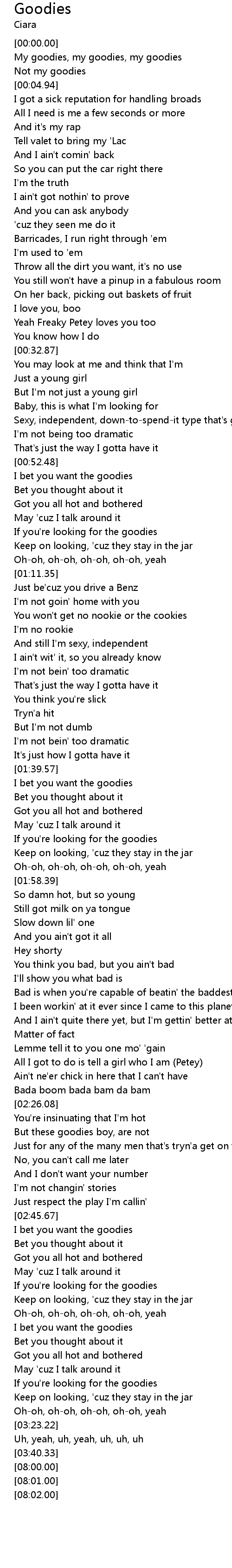 | [00:00.63] | My goodies, my goodies, my goodies |