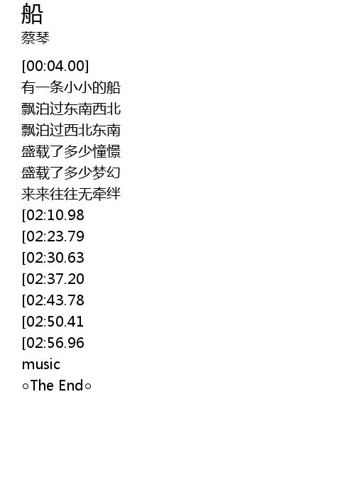 | [00:13.36] | you yi tiao xiao xiao de chuan |