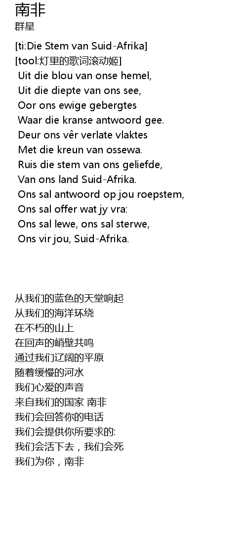 | [00:42.104] | Van ons land Suid-Afrika. |