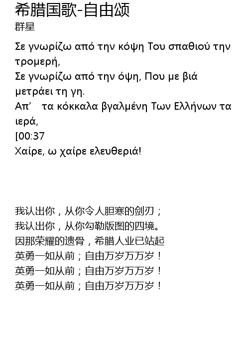 | [00:27.4][00:37][00:46.2] | Και σαν πρώτα ανδρειωμένη, Χαίρε, ω χαίρε ελευθεριά! |