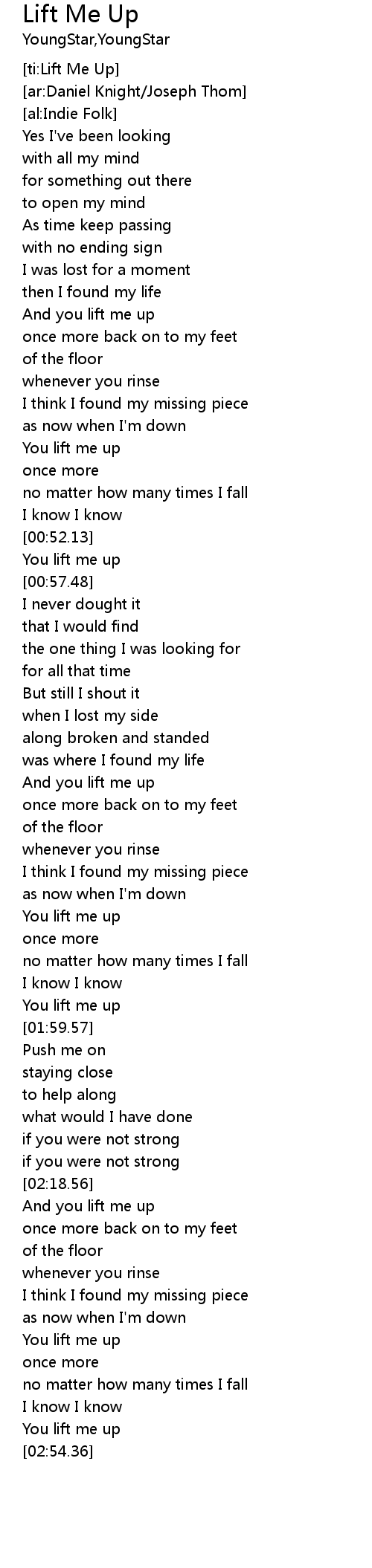 | [01:56.53] | You lift me up |