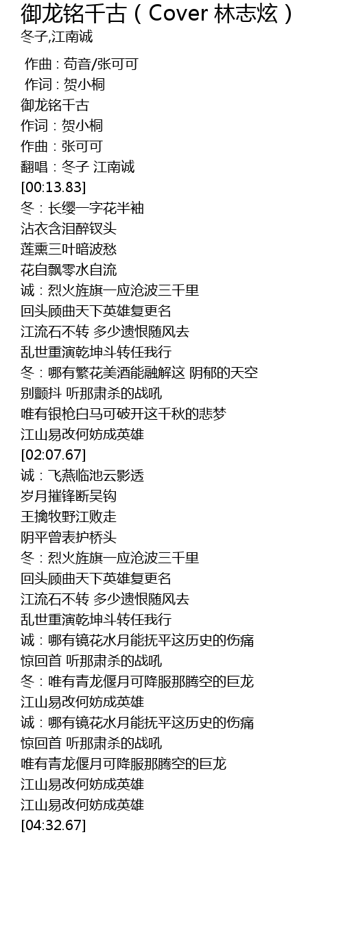 | [00:10.96] | 翻唱:冬子 江南诚 |