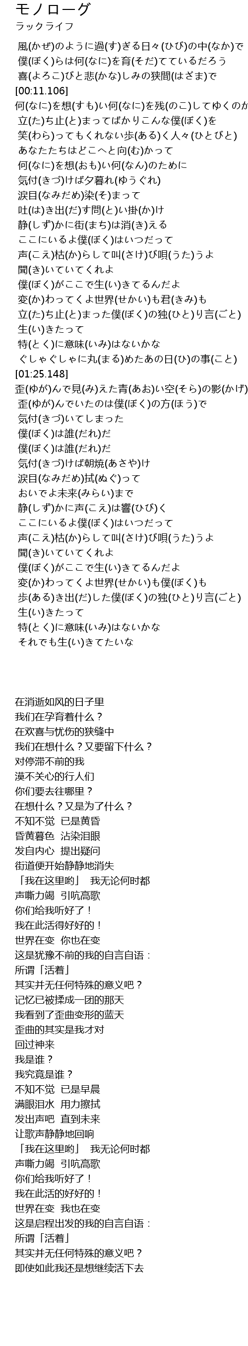 | [01:07.176] | 立(た)ち止(と)まった僕(ぼく)の独(ひと)り言(ごと) |