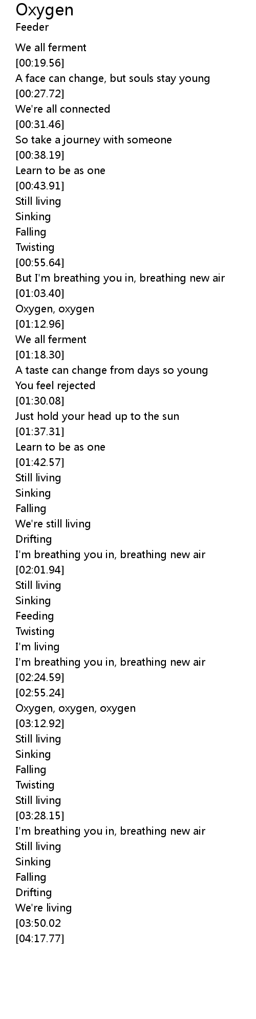 | [03:00.16] | Oxygen, oxygen, oxygen |