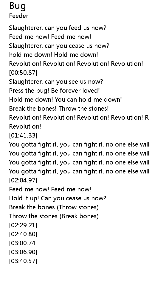| [00:13.43] | Slaughterer, can you feed us now? |