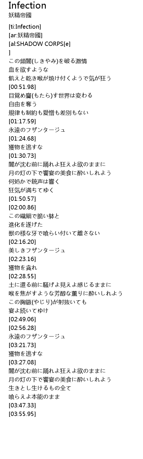 | [03:27.88] | 闇が沈む前に踊れよ狂えよ欲のままに |