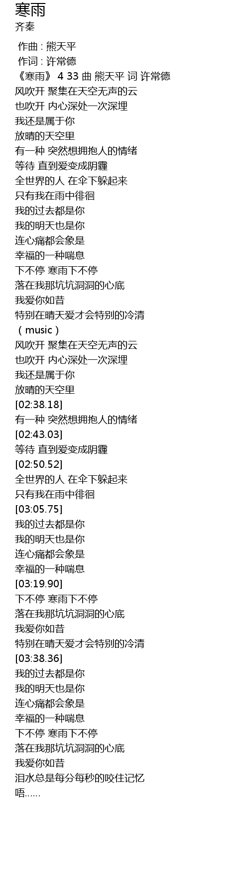 | [00:26.38] | 《寒雨》 4 33 曲 熊天平 词 许常德 |