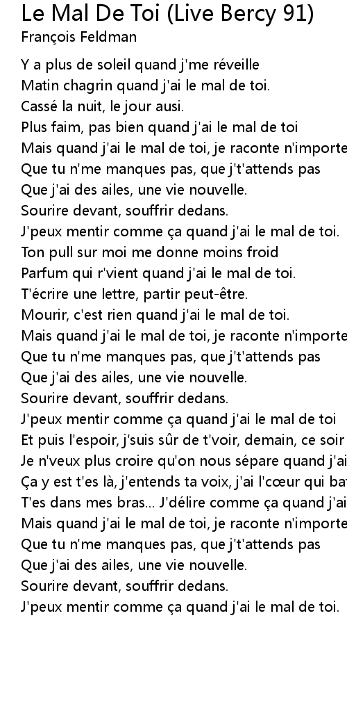 | Je n' veux plus croire qu' on nous sé pare quand j' ai le mal de toi. | |