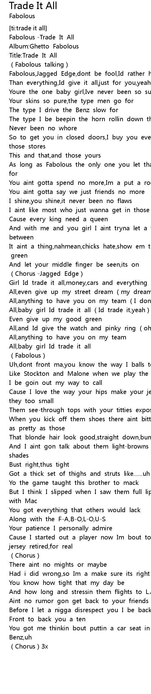| [00:58.954] | Girl Id trade it all,money,cars and everything |