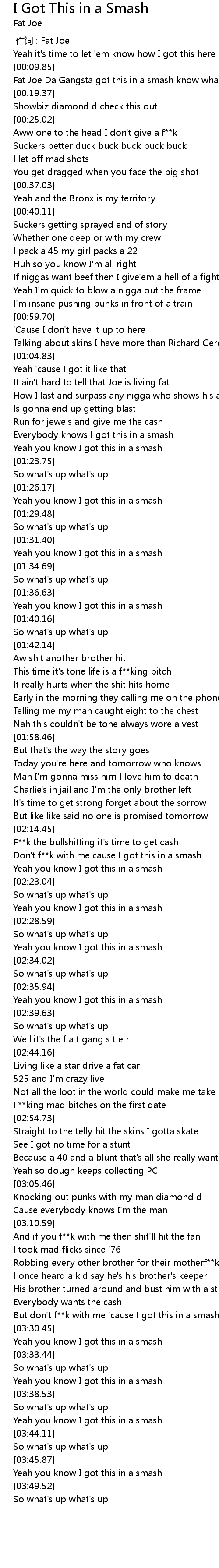 | [00:12.37] | Fat Joe Da Gangsta got this in a smash know what I'm saying |