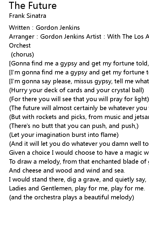 | [I'm gonna say please, missus gypsy, tell me what the future will hold.] | |