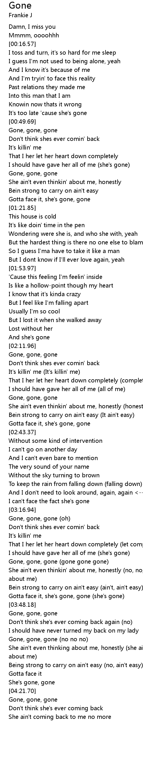 | [01:19.72] | Gotta face it, she's gone, gone |