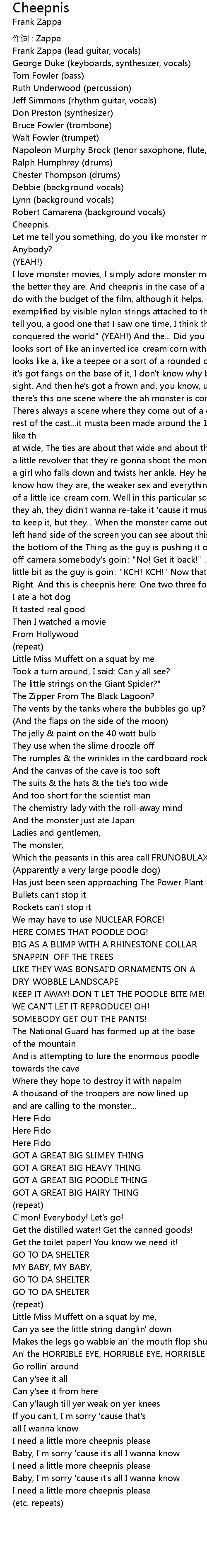 | I love monster movies, I simply adore monster movies, And the cheaper they are, the better they are. And cheepnis in the case of a monster movie has nothing to do with the budget of the film, although it helps. But true cheepnis is exemplified by visible nylon strings attached to the jaw of a giant spider. I'll tell you, a good one that I saw one time, I think the name of the film was "It conquered the world" (YEAH!) And the... Did you ever see that one? The monster looks sort of like an inverted ice-cream corn with teeth around the bottom. It looks like a, like a teepee or a sort of a rounded off pup-tent affair. And ah, it's got fangs on the base of it, I don't know why but it's a very threatening sight. And then he's got a frown and, you know, ugly mouth and everything, And there's this one scene where the ah monster is coming out of a cave. See? There's always a scene where they come out of a cave, at least once. And the rest of the cast...it musta been made around the 1950's. The lapels are about like th | |