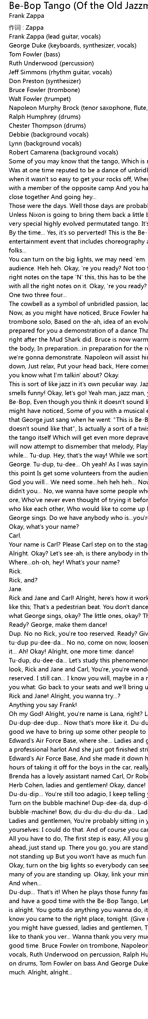 | Now, as you might have noticed, Bruce Fowler has just completed some sort of trombone solo, Based on theah, idea of an evolved tangoevent. Bruce has also prepared for you a demonstration of a dance That he hopes will sweep the ocean right after the Mud Shark did. Bruce is now warming up the important muscles of the body, In preparation... in preparation for the real live BeBop Tango Which we' re gonna demonstrate. Napoleon will assist him. Napoleon just put your horn down, Just relax, Put your head back, Here comes the drill. Okay, heh heh heh, you know what I' m talkin' about? Okay. | |
